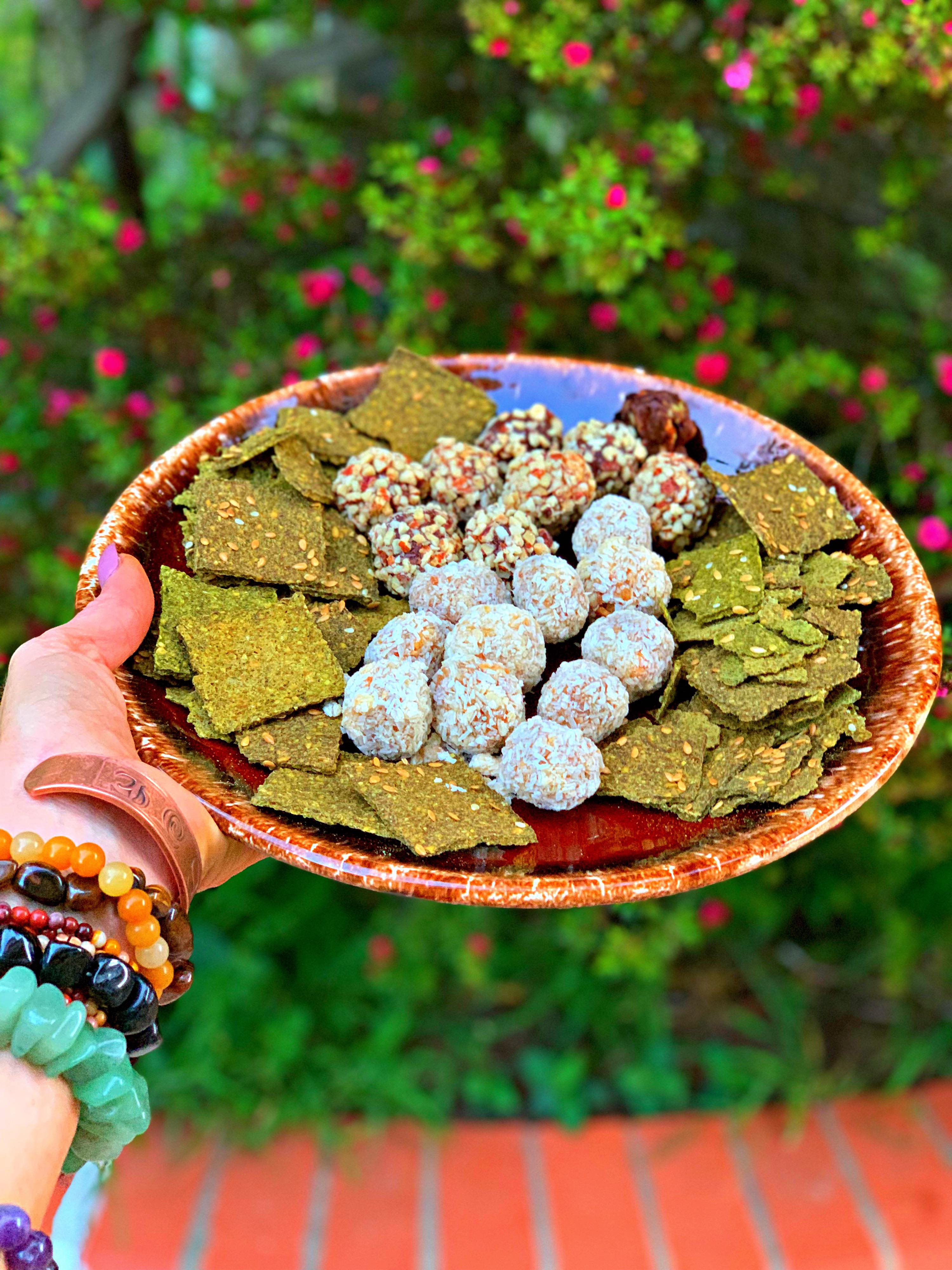 After a nice workout I had the joy of creating a few dehydrated treats.The crackers you see were made from left over juicing pulp, herbs and pumpkin seeds. The raw sweet balls are made from dates, coconut, almonds, spices and walnuts.